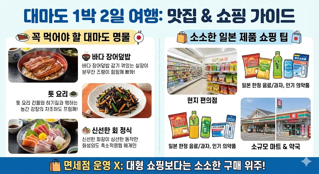 - 대마도 명물: 바다 장어덮밥, 톳 요리, 신선한 회 정식