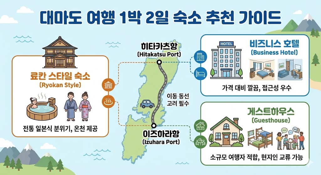 숙소는 주로 히타카츠항 또는 이즈하라항 인근에 분포되어 있어 대마도 여행 1박2일 코스 계획 시 이동 동선을 고려하여 선택하는 것이 좋습니다.