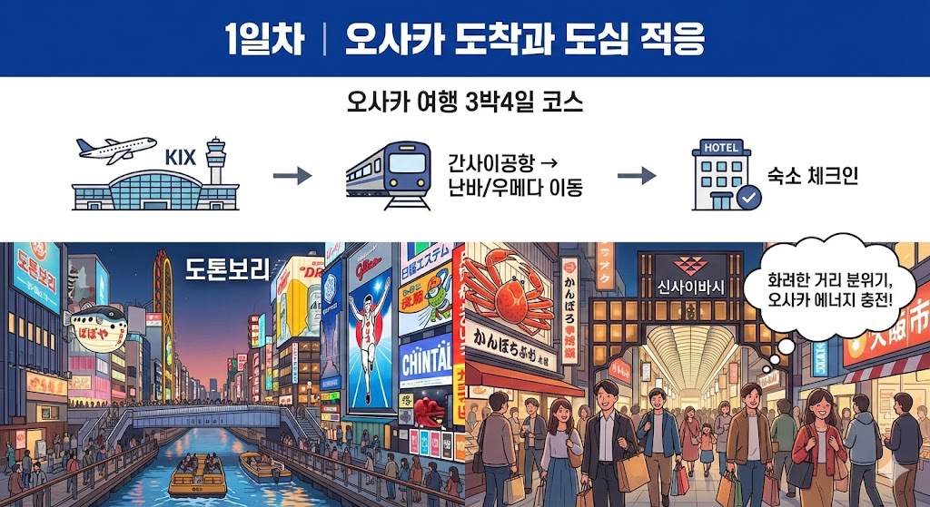 오사카 여행 3박4일 코스의 첫날은 무리하지 않는 것이 중요합니다. 간사이공항 도착 후 난바나 우메다 숙소로 이동해 체크인을 하고, 도톤보리와 신사이바시를 중심으로 가볍게 산책하세요. 화려한 간판과 거리 분위기만으로도 오사카 특유의 에너지를 충분히 느낄 수 있습니다.