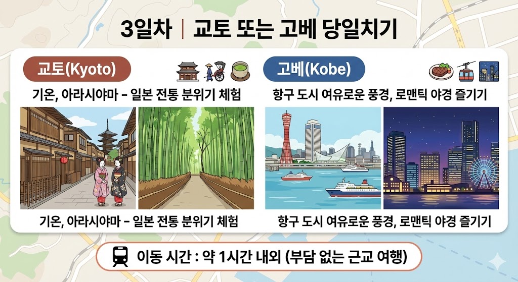 오사카 여행 3박4일 코스에서 가장 만족도가 높은 일정이 바로 근교 도시 당일치기입니다. 교토를 선택하면 기온과 아라시야마에서 일본 전통 분위기를 느낄 수 있고, 고베를 선택하면 항구 도시 특유의 여유로운 풍경과 야경을 즐길 수 있습니다. 이동 시간은 1시간 내외로 부담이 적습니다.