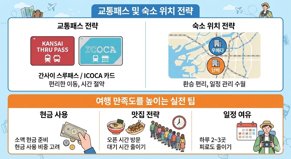 오사카 여행 3박4일 코스를 효율적으로 완성하려면 교통패스 선택이 중요합니다. 간사이 스루패스나 ICOCA 카드를 활용하면 이동이 편리합니다. 숙소는 난바나 우메다처럼 환승이 쉬운 지역을 선택하면 일정 관리가 훨씬 수월해집니다.