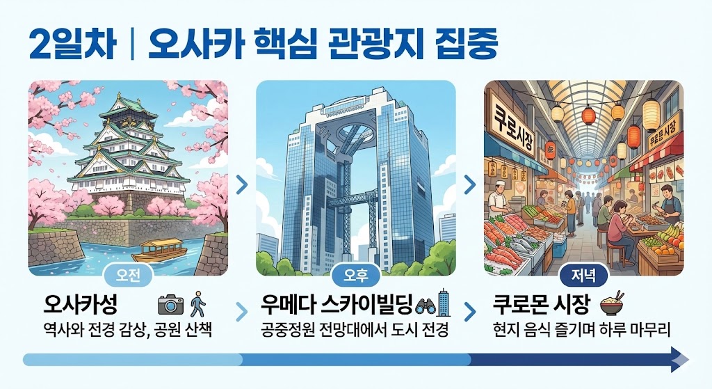 둘째 날은 오사카의 상징적인 명소를 둘러보는 날입니다. 오전에는 오사카성을 방문해 역사와 전경을 감상하고, 오후에는 우메다 스카이빌딩 전망대에서 도시 전경을 내려다보세요. 저녁에는 쿠로몬 시장에서 현지 음식을 즐기며 하루를 마무리하면 좋습니다.