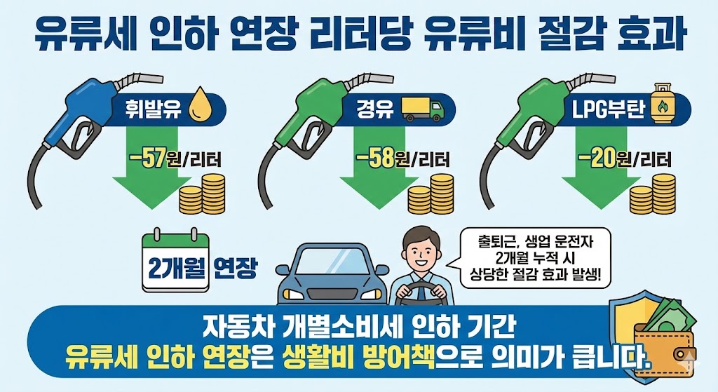 유류세 인하 연장은 연말을 앞두고 차량 구매와 생활비 부담을 동시에 줄여주는 정부의 대표적인 물가 안정 대책입니다.