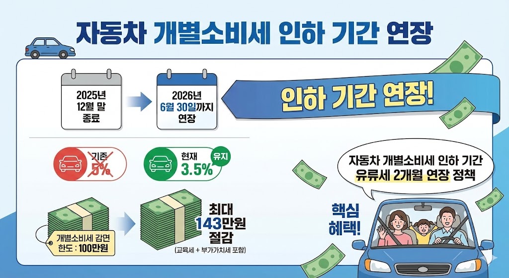 자동차 개별소비세 인하 기간 유류세 2개월 연장은 단기적 물가 안정과 실질적인 가계 부담 완화를 동시에 노린 정책입니다. 차량 구매 계획이 있거나 유류비 부담이 큰 가구라면 이번 연장 기간을 적극 활용하는 것이 합리적인 선택이 될 수 있습니다.