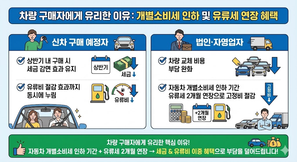 이런 점에서 자동차 개별소비세 인하 기간 유류세 인하 연장은 생활비 방어책으로 의미가 큽니다.