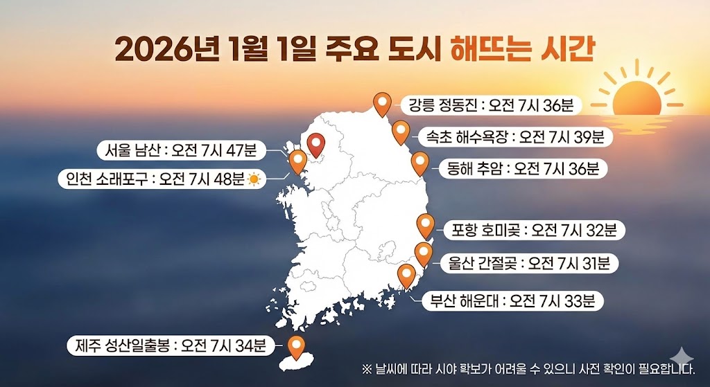 이번 글에서는 2026년 1월 1일 기준으로 주요 지역의 해뜨는 시간을 포함해