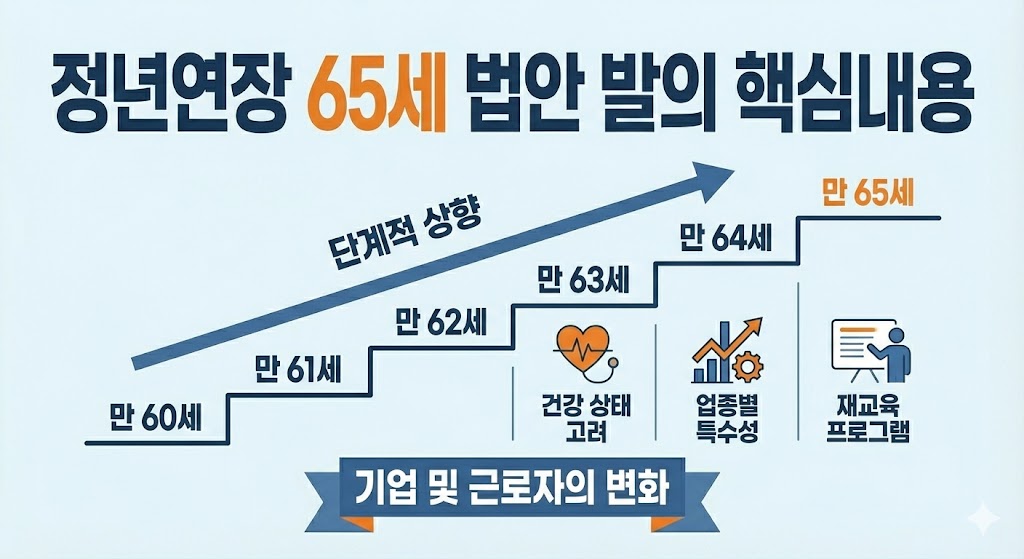 법안의 기본 취지는 현재 만 60세인 정년을 만 65세로 단계적으로 상향하는 것입니다. 이 과정에서는 노동자의 건강 상태, 업종별 특수성, 고령 근로자의 재교육 프로그램 등 다양한 요소가 함께 고려됩니다. 정년연장 65세 법안 발의가 현실화될 경우, 기업은 인력 운용 방식을 조정해야 하고 근로자 역시 커리어 계획을 새롭게 세울 필요가 생깁니다.